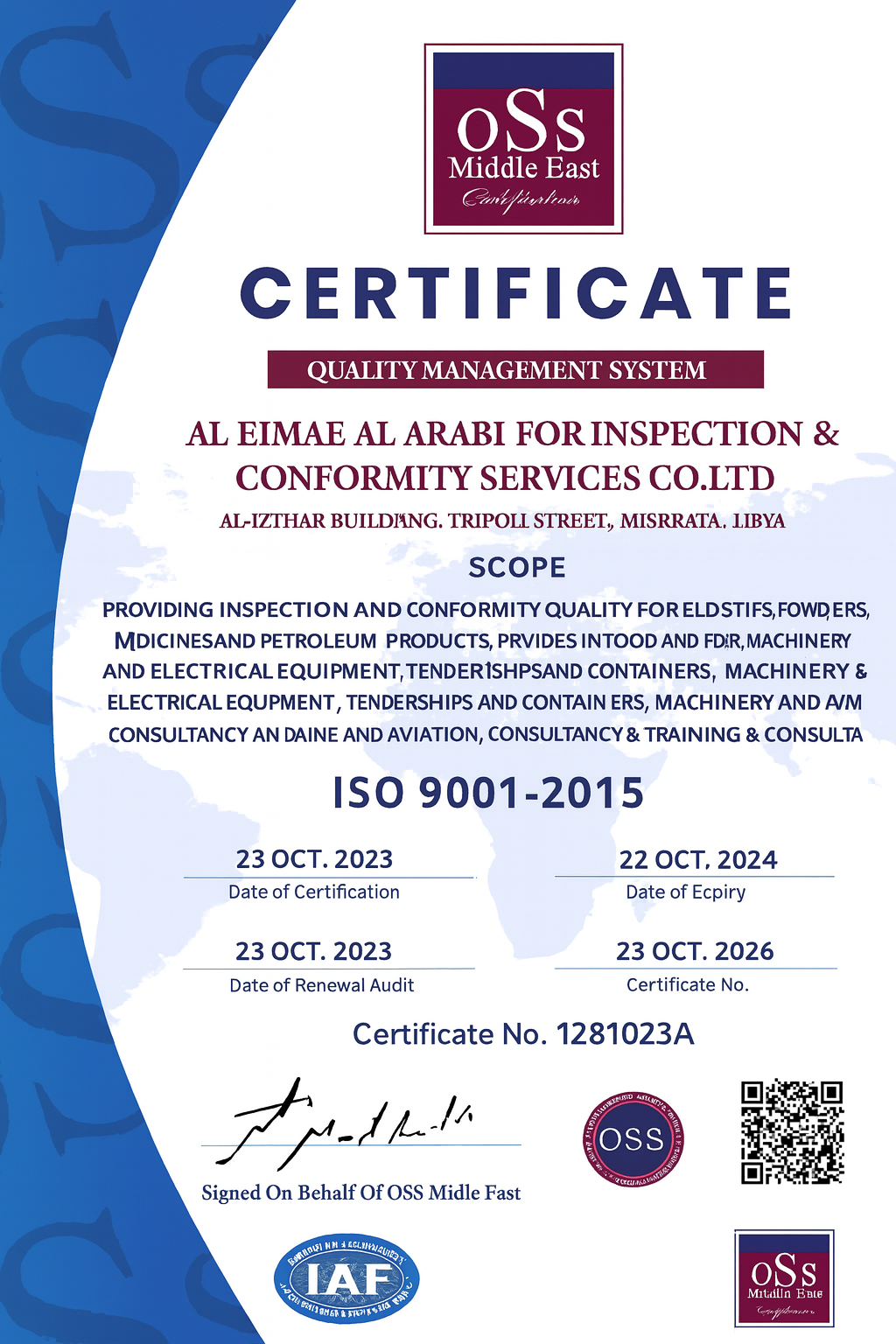شركة تفتيش ليبية 100% ذات مسؤولية محدودة، تأسست في سنة 2018، متخصصة في تنفيذ جميع أعمال التفتيش والمعاينة والمعايرة على السلع والمواد الواردة والصادرة، وذلك وفق المعايير والمواصفات القياسية المعترف بها محليًا ودوليًا.