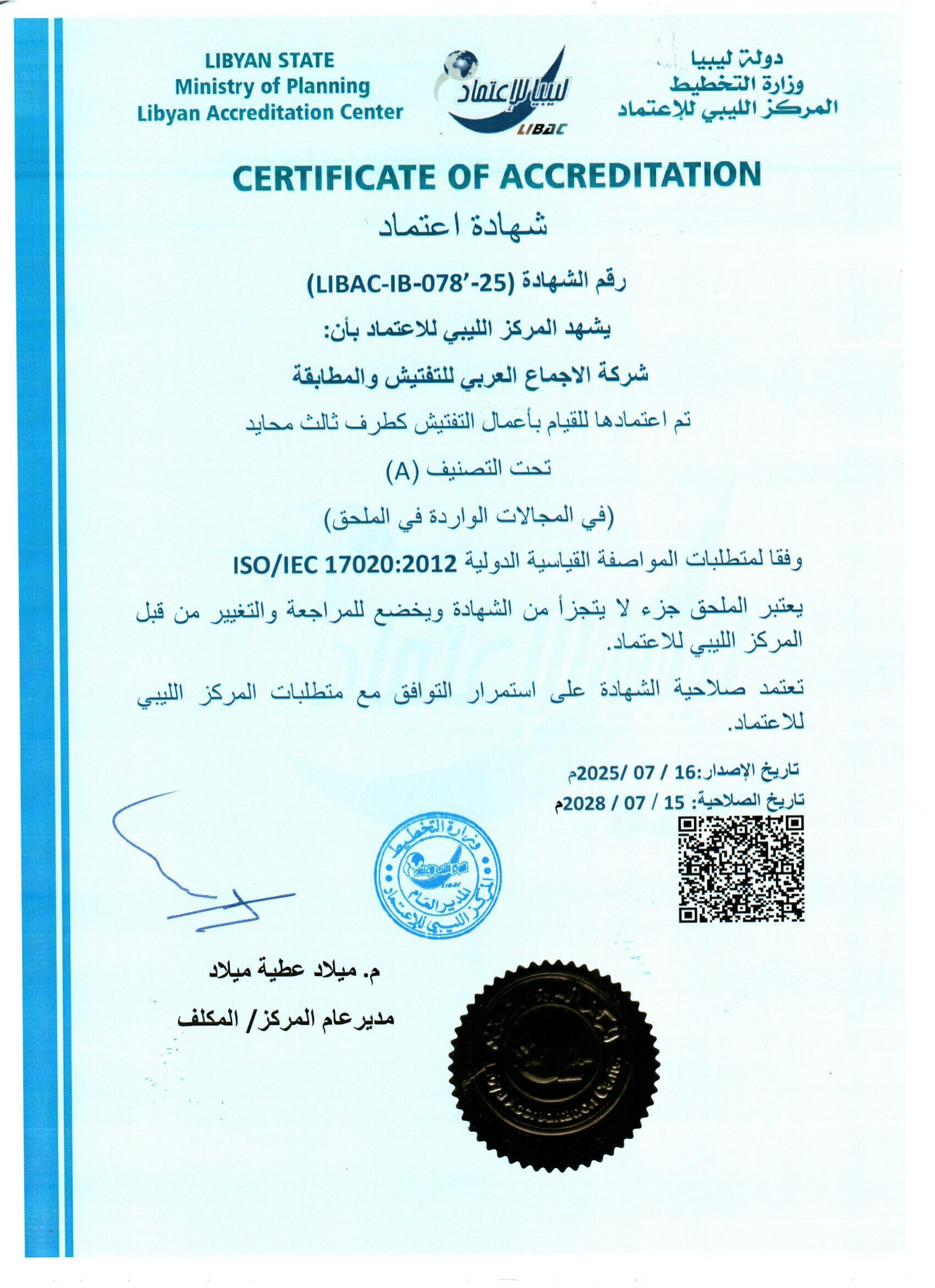 تم إعتمادها للقيام بأعمال التفتيش كطرف ثالث محايد تحت التصنيف (A)
